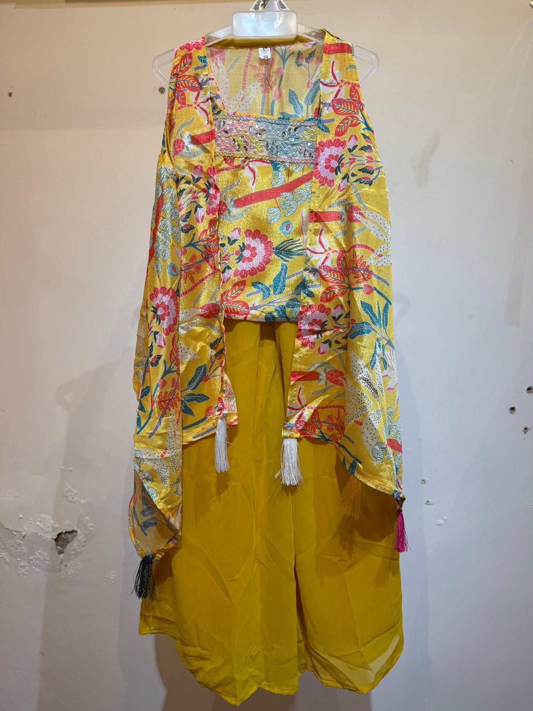 Bright Yellow bold Flowers and banana leaf flowy shrug palazzo set