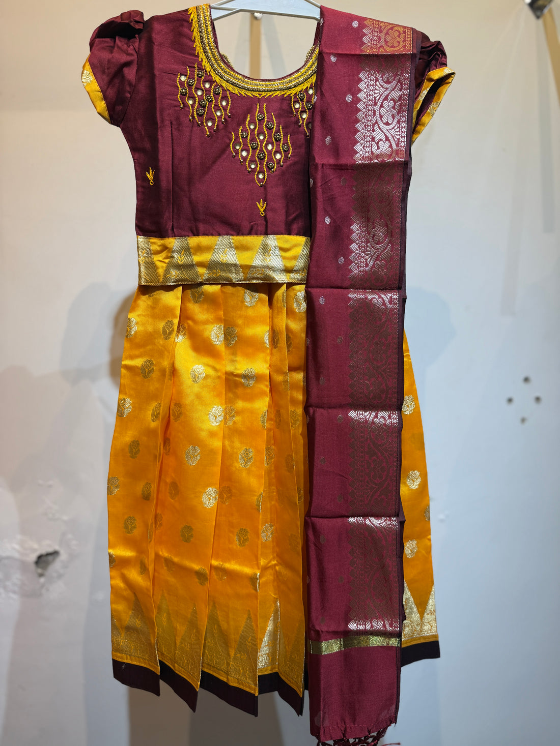 Art silk yellow top ,brown bottom pavadai sattai