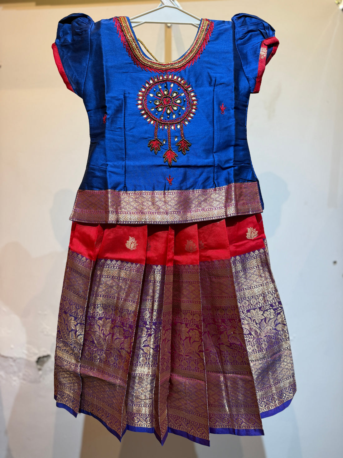 Art silk blue and redish orange big border pavadai sattai