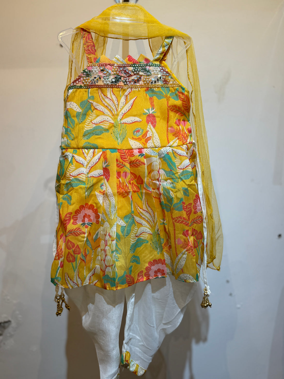 Yellow flowy shrug with blossom flower embroidered crop top and palazzo set