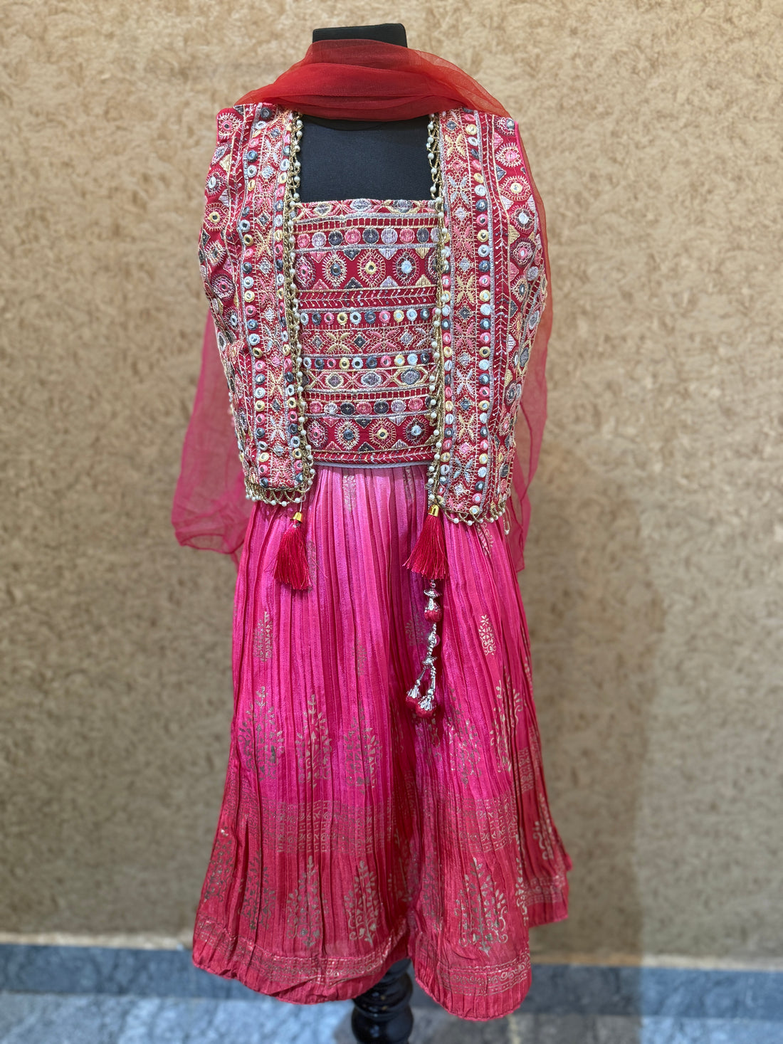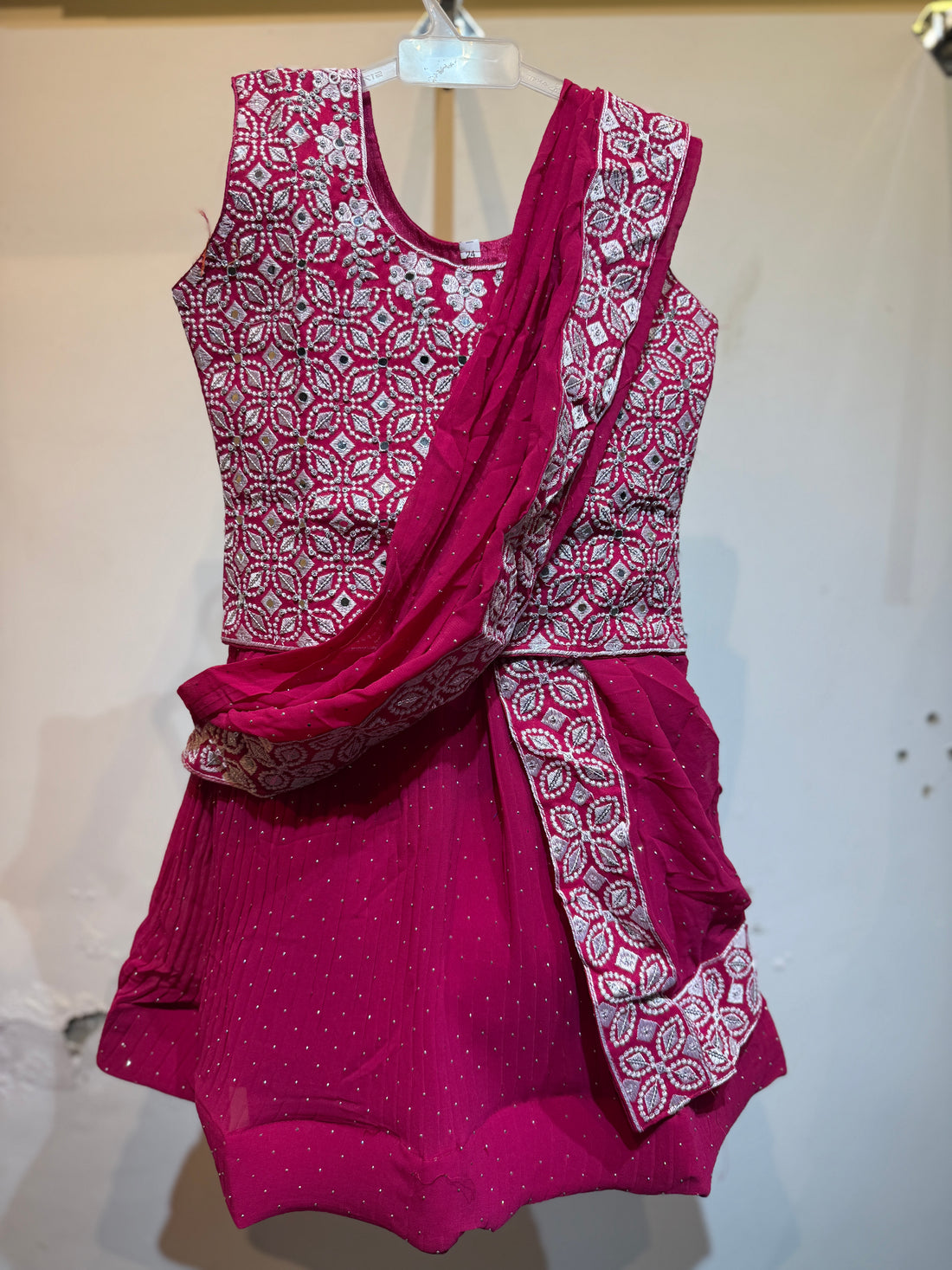 Bright pink Saree model Festive designer choli with embroidered net long shrug