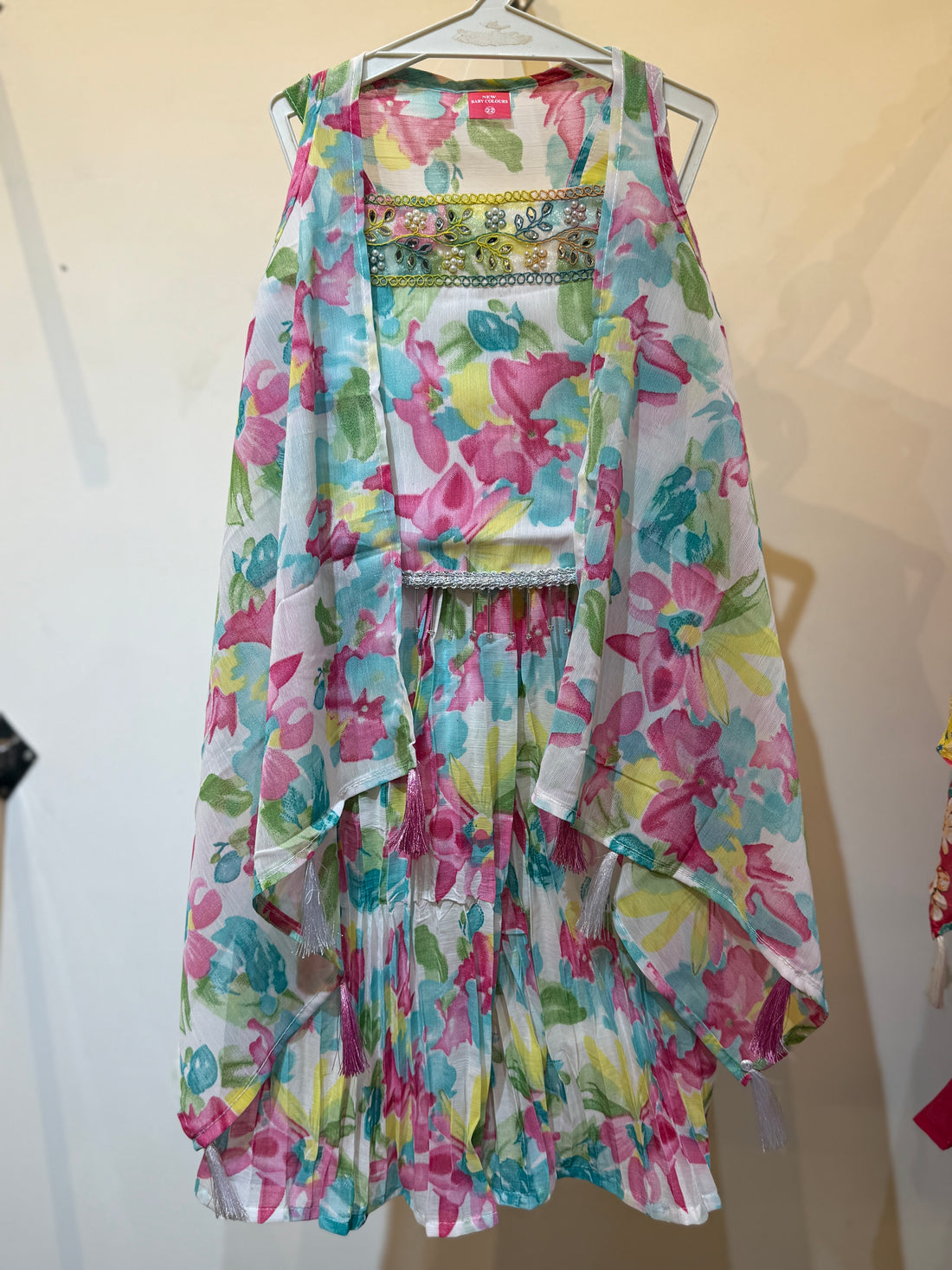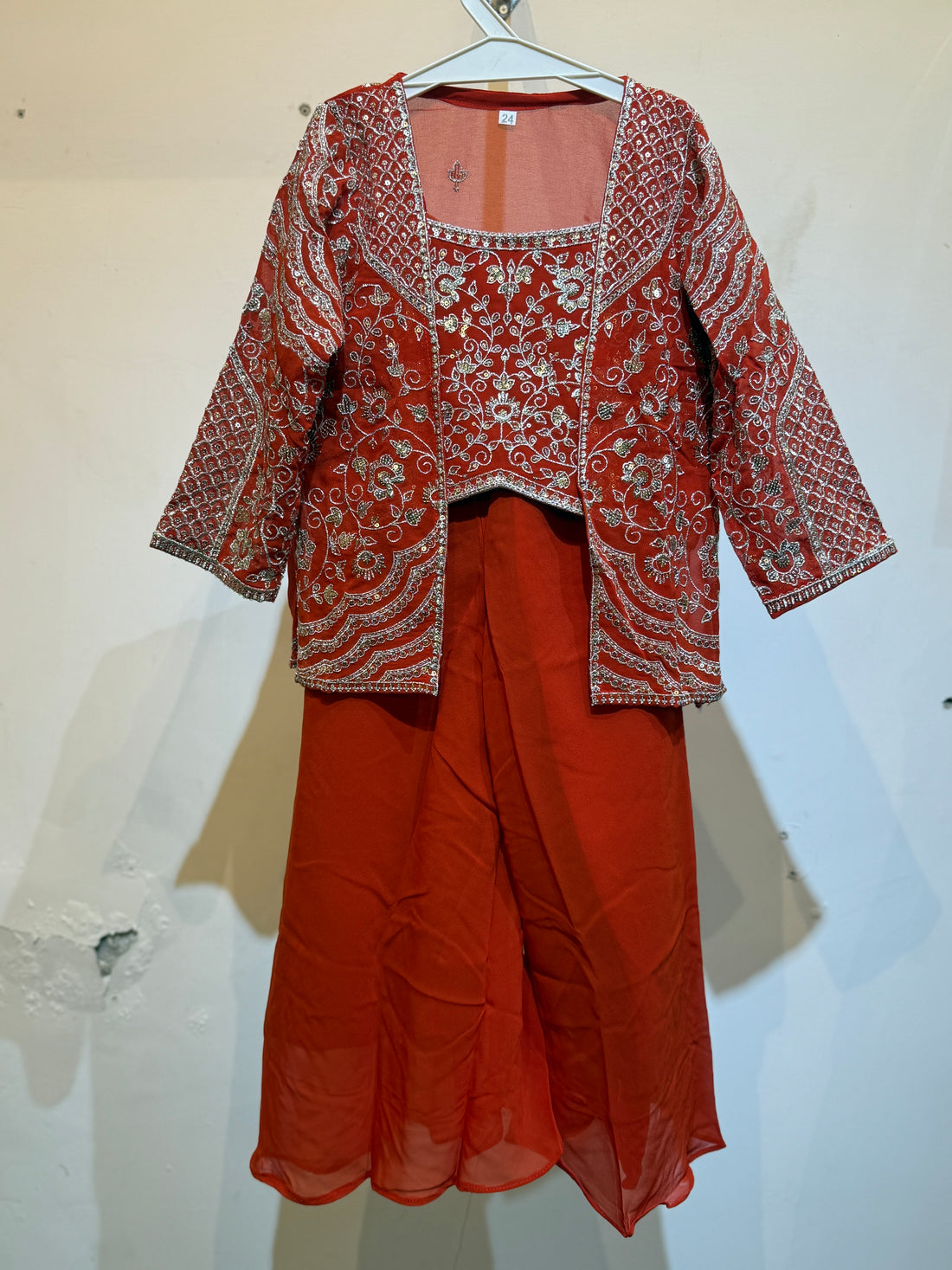 Festive designe Premium Peach palazzo set with orange floral long shrug