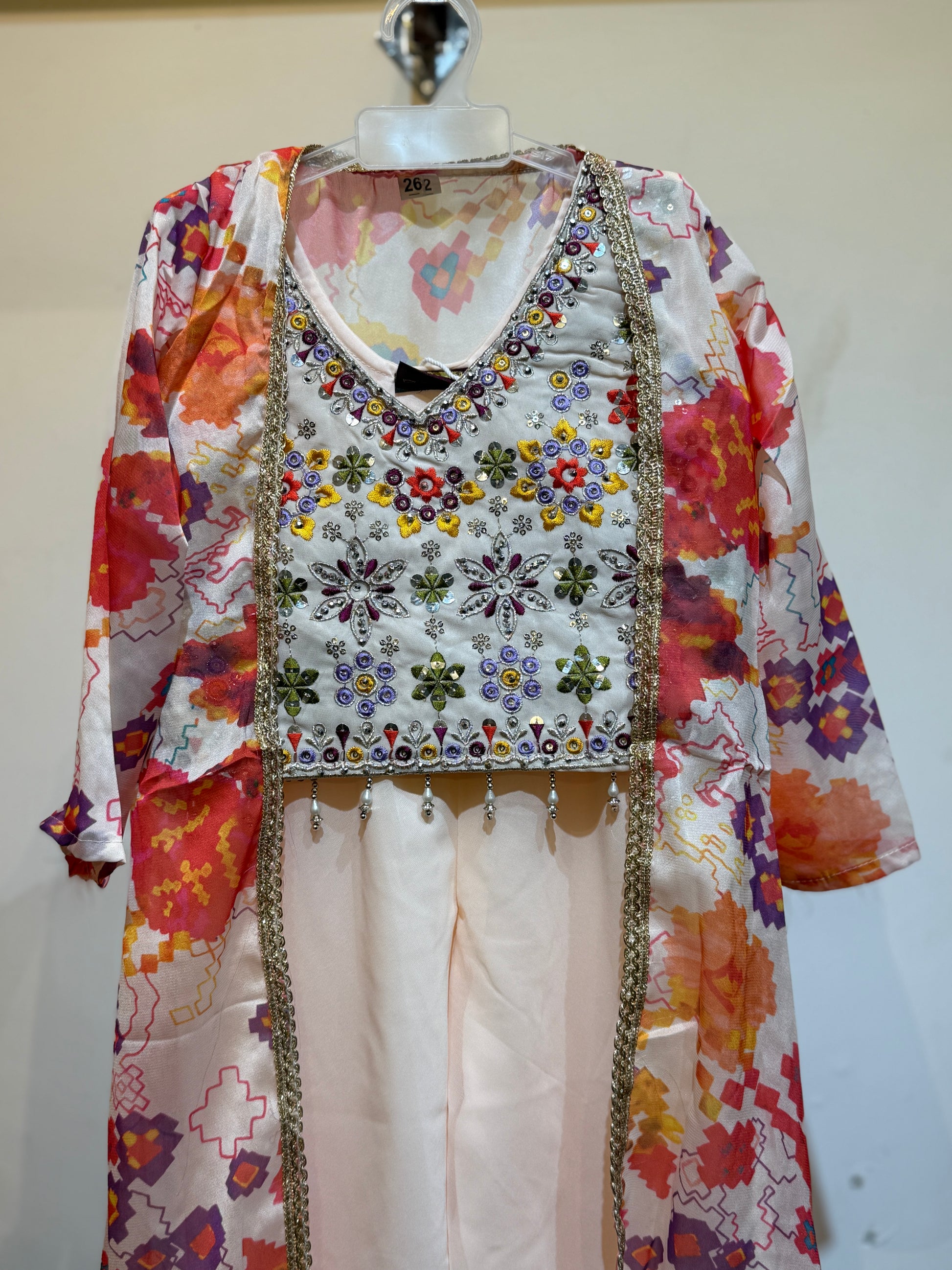 Festive designe Premium Peach palazzo set with orange floral long shrug