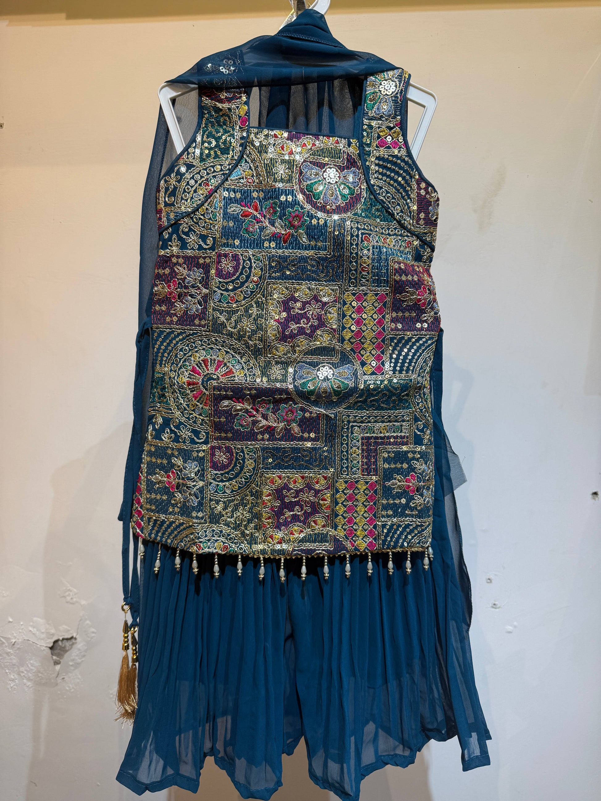 | It is a festive look, perfect for weddings, Diwali, or other special occasions,the beautifully designed jacket, adorned with vibrant embroidery set. |