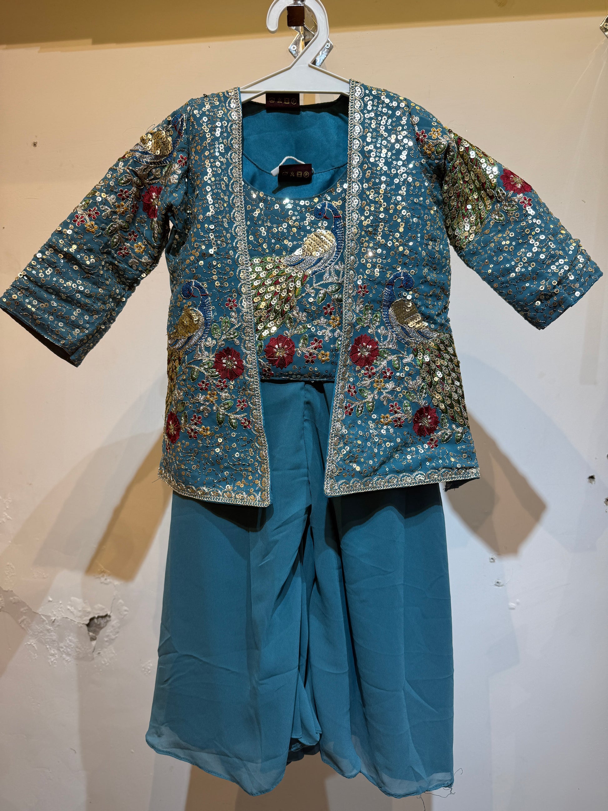 Muted blue peacock pattern palazzo set with shrug