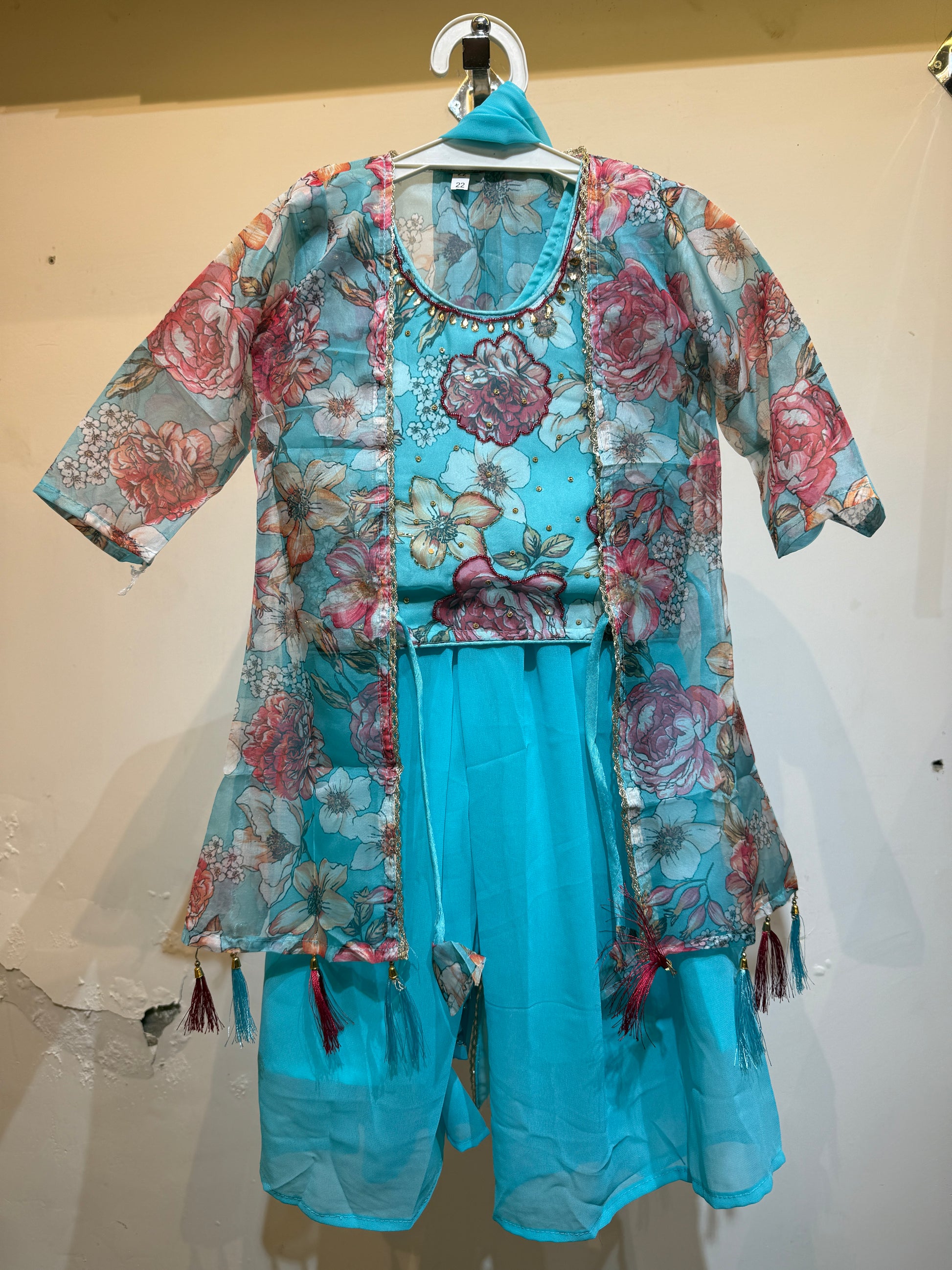 Sky blue floral organza shrug and top palazzo suit